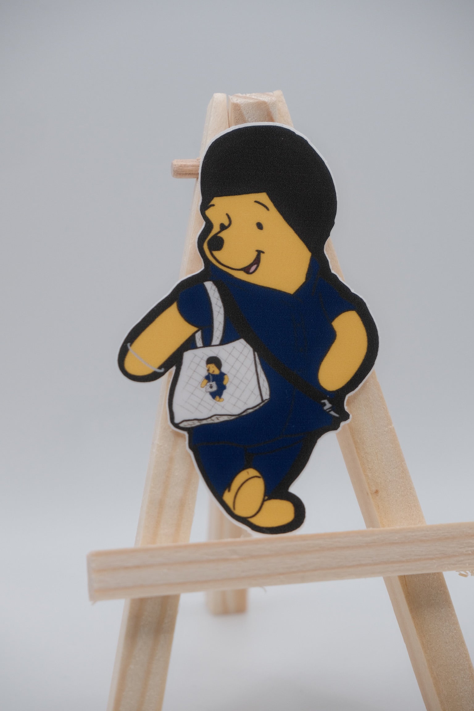 3x2 inch sticker of yellow bear wearing blue suit and dastar, holding a tote bag.